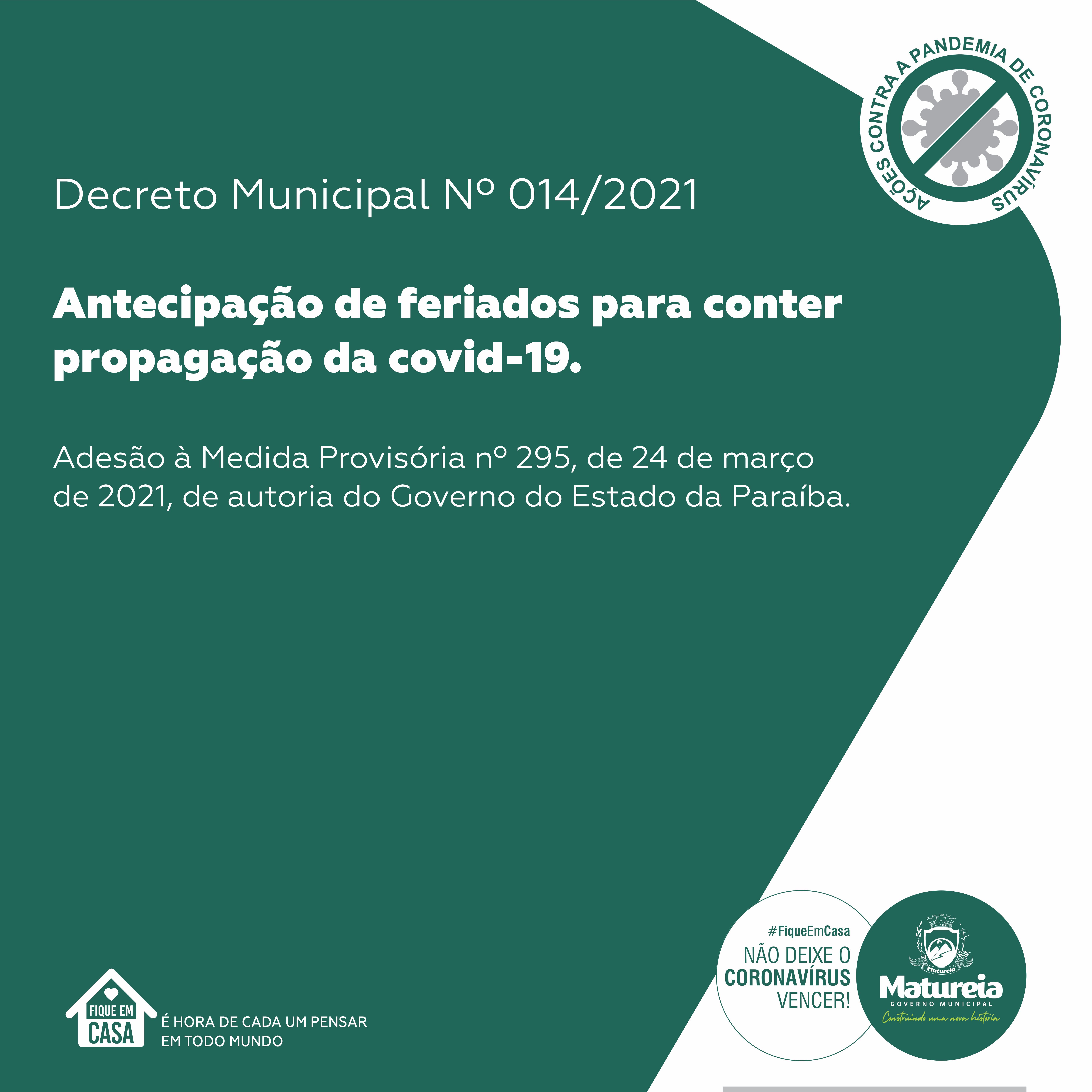 A Prefeitura Municipal de Matureia divulgou nesta sexta-feira (26) o Decreto Municipal Nº 014/2021 que dispõe sobre a adesão à medida provisória nº 295, de 24 de março, de autoria do Governo do Estado da Paraíba, que antecipa feriados para conter a disseminação do contágio pelo coronavírus.