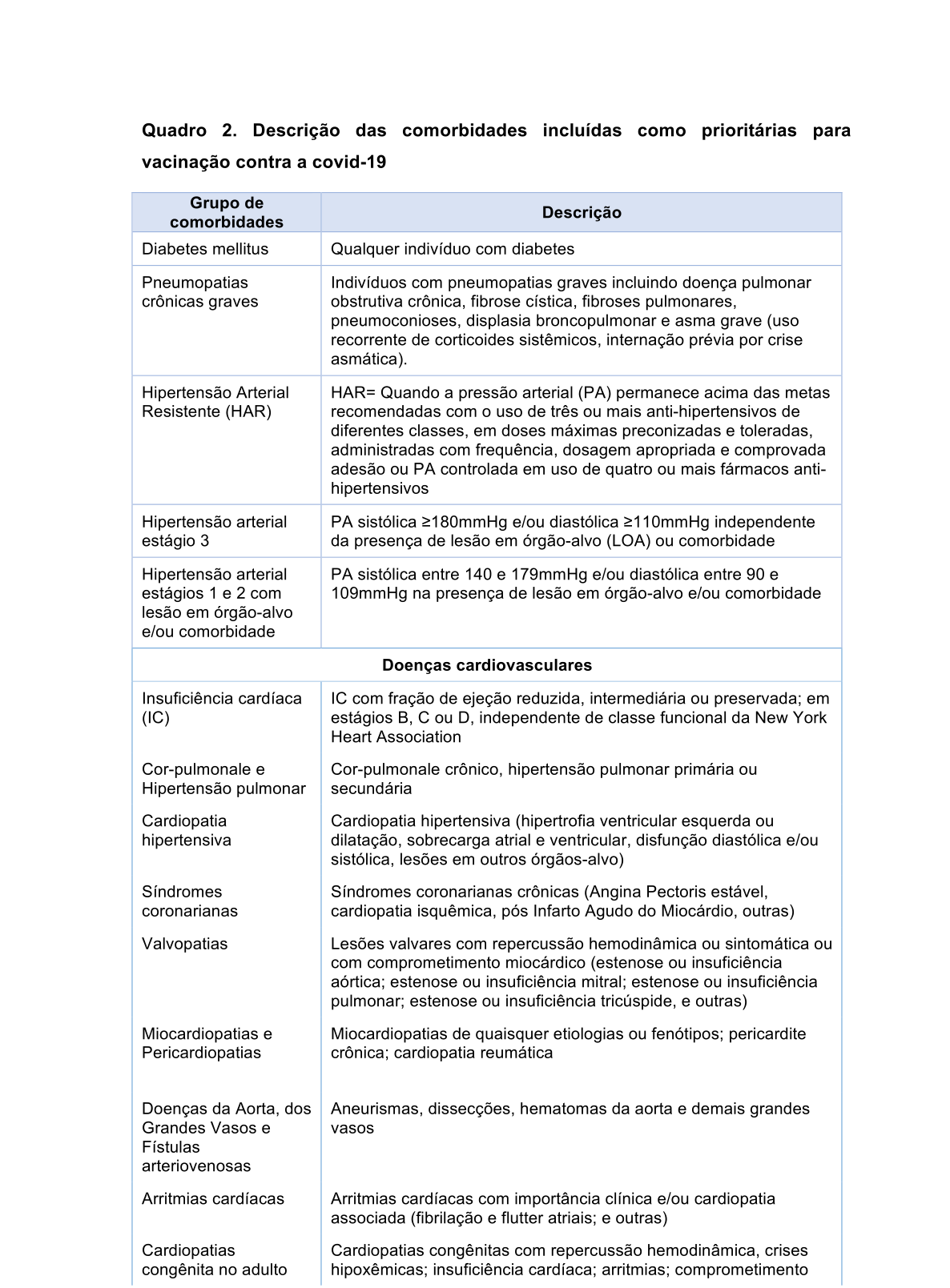 Essas e outras comorbidades incluídas como prioritárias para vacinação estão descritas no Plano Nacional de Vacinação Contra Covid-19.
