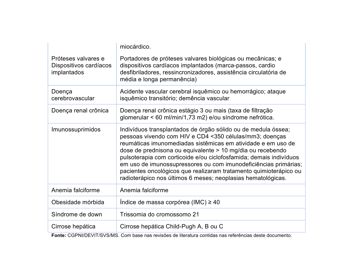 Fazem parte do grupo de comorbidades: diabetes, pneumopatias crônicas graves (doenças que afetam os pulmões), hipertensão (casos mais graves), insuficiência cardíaca, cardiopatia, arritmias cardíacas, doença cerebrovascular, próteses valvares, dispositivos cardíacos implantados, cardiopatas congênita no adulto, valvopatias, síndromes coronarianas, cardiopatia reumática, doença renal crônica, pericardite crônica, aneurismas, obesidade mórbida, cirrose hepática, entre outras comorbidades. Gestantes e puérperas com comorbidades, independentemente da idade, também fazem parte do grupo prioritário.