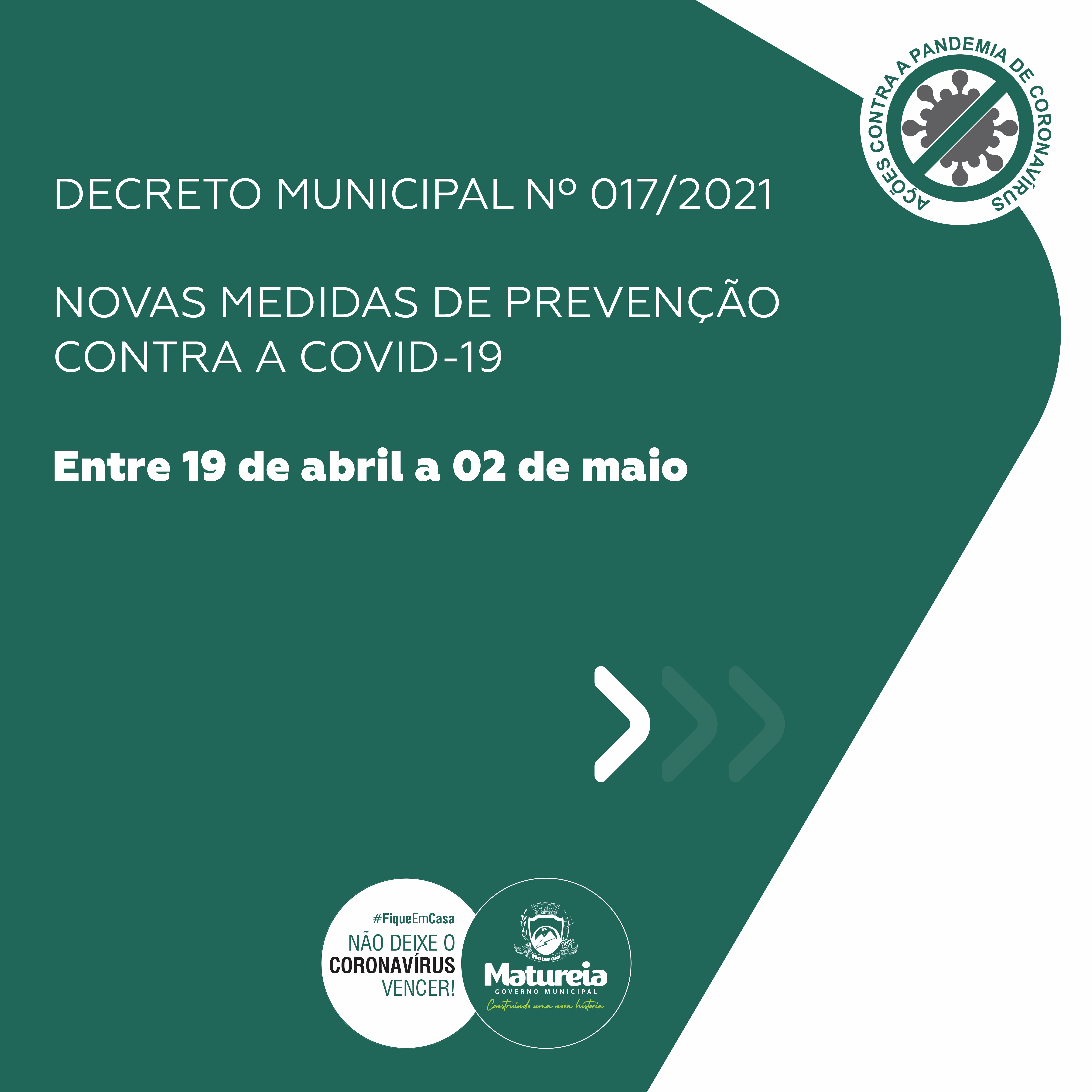 O Governo Municipal de Matureia divulgou novo Decreto Municipal Nº 017/2021 que dispõem sobre as novas medidas de prevenção contra a covid-19 no período entre 19 de abril a 02 de maio.
