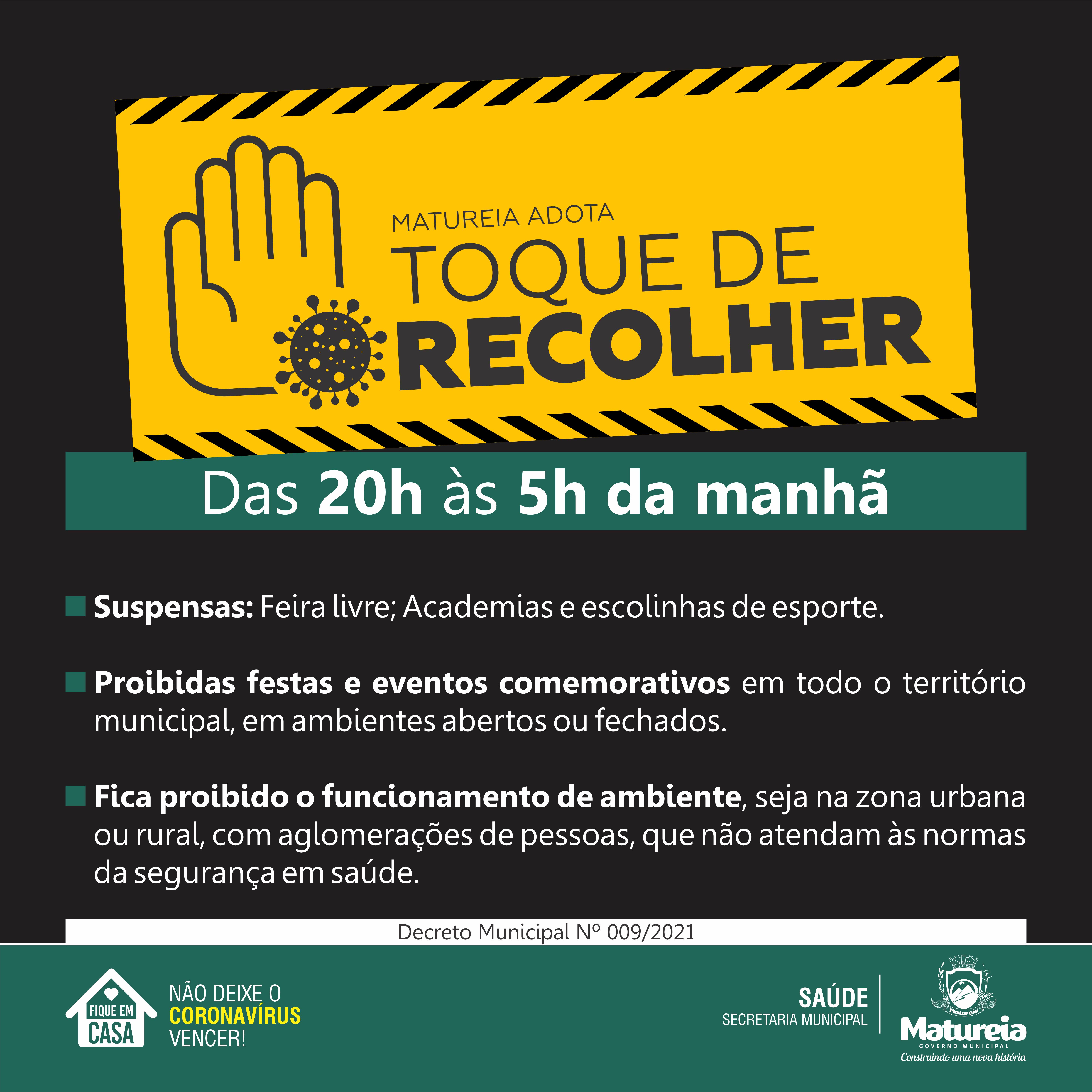 Fica estabelecido, entre 24 de fevereiro de 2021 até 10 de março de 2021, no âmbito do município de Matureia, o toque de recolher no horário entre 20h às 05h do dia seguinte, período em que só devem ocorrer deslocamentos para exercícios de atividades essenciais e devidamente justificadas, ficando o responsável pelas informações, sujeito às penalidades legais, caso não se comprove a veracidade da justificativa apresentada.
