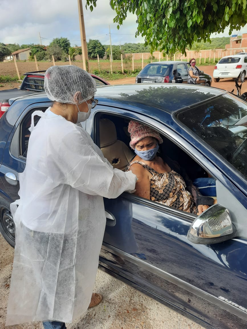 Alguns idosos chegavam de carro à unidade e outros idosos deslocaram-se de outra forma até à unidade para tomarem a vacina, estes, também foram vacinados na área externa da UBS. A aplicação das doses foram administradas pela Coordenadora de imunização e vacinadora de Matureia, Maria do Socorro Martins.